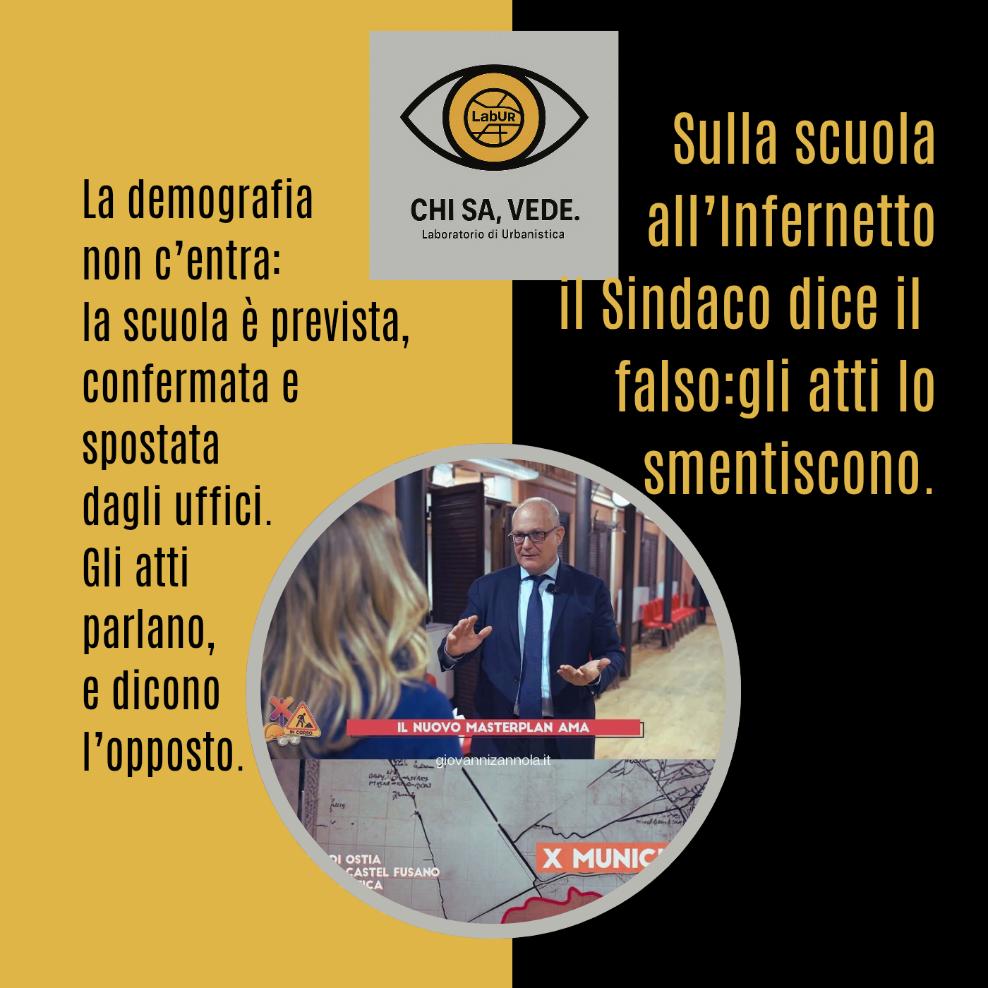 Nelle dichiarazioni rilasciate in questi giorni su Canale10 tv, il Sindaco di Roma, Roberto Gualtieri, rispondendo alla domanda di un cittadino sul costruendo Centro di Raccolta Rifiuti all’Infernetto, ha affermato che in quell’area “la scuola non c’era e non ci sarà, perché non ci sono abbastanza bambini”.